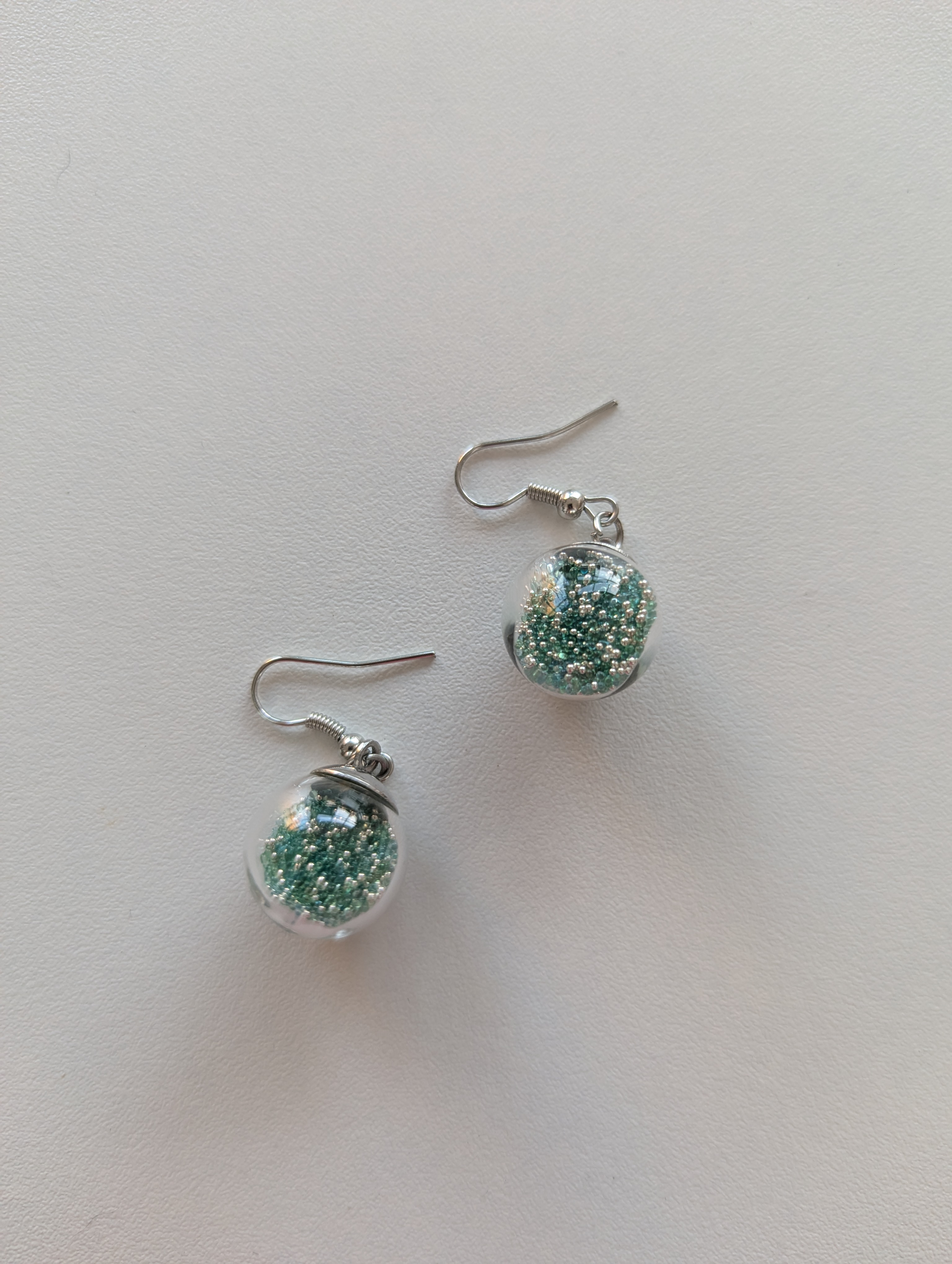 Boucles d’oreilles boule remplies de billes vertes et argentées